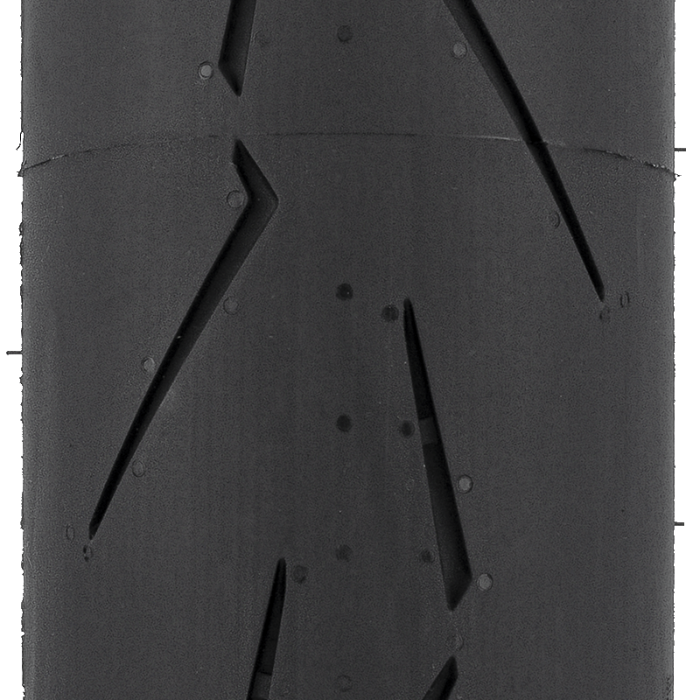 La bande de roulement joue elle aussi un rôle essentiel. Elle fait appel à la dernière version du motif breveté Flash. Il s'agit d'encoches diagonales dont la forme est conçue spécialement pour assurer une motricité stable et une grande adhérence à différents angles d'inclinaison. Ces encoches facilitent la négociation des virages. Elles garantissent également un drainage efficace lors de la conduite de la moto en position verticale. Grâce aux barrettes transversales, la bande de roulement se réchauffe rapidement et l'usure est régulière.